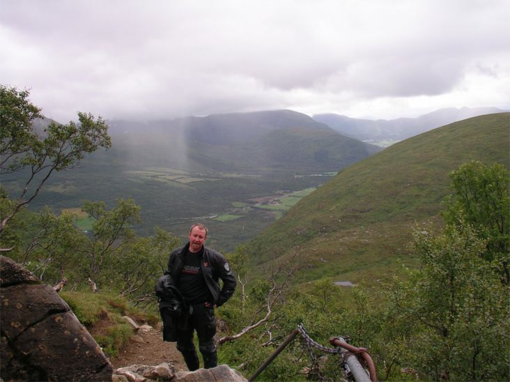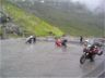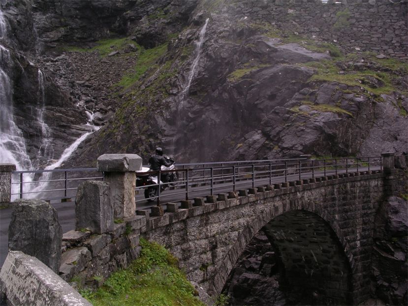 Och Aste får upp Duccen på bakhjulet, över bron mitt i Trollstigen.