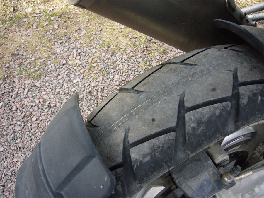 Och när jag inspekterade cykeln dagen efter så upptäckte jag något som håller på att bli en lite otrevlig vana. Jag tyckte nog att däcken hade ganska många mil kvar när jag hade tittat senast men än en gång hann korden ut genom gummit innan jag hade funderat på att byta. Så det var bara att slänga sig på telefonen till HightSide Fredrik och beställa en ny uppsättning däck. Problemet var att jag hade bestämt mig för att montera "Tirewatch" i däcken nästa gång jag skulle byta. Det är en mätare som monteras inuti däcken med en display på instrumentpanelen där man ser däcktryck fram och bak eller temperatur. Problemet var att den fanns inte att få tag på i Sverige utan importören finns i Norge. Så efter diverse telefon samtal så spikades ett möte i Skien med försäljaren. Så det blev en go liten 70 mila tripp extra till Norge. Lite jobbigt hemåt på kvällen med bara någon plusgrad och regnblandad snö dimma. Men det var helt ok. Och dagen efter fick jag mätarna monterade när Fredrik bytte däck. Och det fungerar helt klockrent. Och det känns mycket bra att ha perfekt kontroll på trycket i däcken. Undrar om det finns slitagevarnare oxå? Skulle nog behöva det. Så här såg däcken ut hemkommen från Norge:
