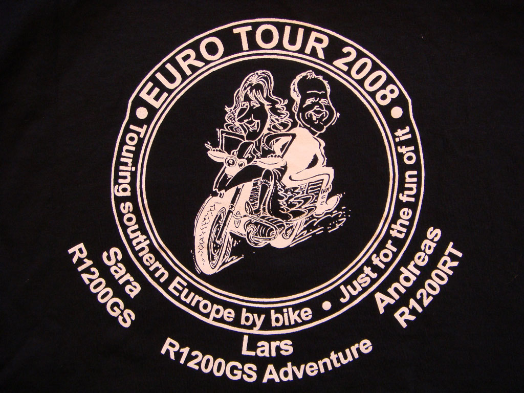 Så när jag kom ner till Aste o Sara på lördagseftermiddagen den 5 juli så fick jag den läckra tröjan som första bilden visade, dom hade tryckt upp 3 omgångar var med respektive förnamn på bröstet, snacka om EuroTour team. Jag hade dessutom svängt förbi Touratech i Lidköping på vägen ner från Värmland och handlat en ny IMO 100R300, en ganska avancerad färddator, som jag skulle byta ut eftersom jag hade lyckats sabba min förra med lite för mycket laddning. Samtidigt som jag bytte färddator så skulle Aste montera radio på min cykel så att vi kunde språka oss ned genom Europa, Sara o Aste hade ju redan fast monterade comradio på sina cyklar. Så efter en massa mat, Guinness o W så gick vi och lade oss med stora förväntningar på morgondagen. Och på söndagsmorgonen skulle bara Sara o Aste packa ner det sista, sedan var vi på G, 3 BMW boxer, 2 tält, 1 skåning, en halvskåning och en Aste samt 5 st GPS'er (2820 o 278 på min Wolf, 2820 o 2720 på Aste's o en 2820 på Saras men gissa om vi lyckades köra fel ändå...?) Efter att ha kört bron över till Köpenhamn så tog vi färjan över till Puttgarten och sedan blev det Autobahn söderut. Efter en dags körning så svängde vi av och hittade ett litet samhälle som hette Behringen. Det bestod av en korsning, 40 hus och 3 pensionat. Vi var väl lite skeptiska men vi valde ett på måfå och svängde upp men det såg helt igenbommat ut. Men så kom kocken utspringade och undrade vad vi ville så vi förklarade att vi önskade öl, mat och övernattning, i den ordningen, wiskey hade vi med själva. Och det var inga problem. Det visade sig vara kanon fina rum, supergod mat och allt till ett hyggligt pris. Och cyklarna fick vi parkera skyddade under carporten. Det var då, när vi skulle plocka med oss ombyte in som jag upptäckte att jag i hastigheten hemma hade lyckats packa ner ett par av Malins Björn Borg boxer trosor vilket gladde mina kamrater något alldeles kopiöst, och mig med. Men det riktiga problemet uppstod vid hemkomsten när jag beklagade mig för Malin att jag hade råkat fått med hennes trosor på Europa turnén och hon snabbt och bestämt hävdade att det inte var och aldrig hade varit hennes trosor. Hmmmmm. Men jag tror att jag lyckades klara mig ur diskussionen genom att vara "ganska" säker på att jag hade köpt ett packe Björn Borg kläder till henne när vi var på sportshopen i Lysekil senast, jag tror fortfarande på att det var så. Hmmmm.