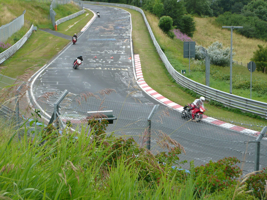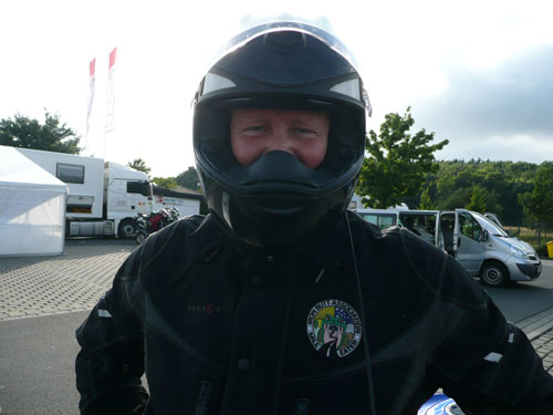 Sedan på kvällen så kunde vi ju bara inte hålla oss och eftersom min fot nu var "ganska" ok så var det ju bara att glida över till stora entrén till nordslingan. Och gissa om det var helt otroligt underbart skit kul. 20.8 km rent och kärt nöje med drygt 300 meter höjdskillnad. Så det var bara att lösa biljett och släppa in sig själv. På allmänhetens åkning så kan man få köra om allt från passagerar bussar och gamla engelska cabroler samtidigt som man blir omblåst av Ferrari bilar och snabbare cyklar. Men jädrar vad kul det var. Aste körde runt med Sara bakpå sin RT men det hindrade honom ju inte att dra förbi ett antal hojar och hinna vänta en stund på mig vid målet. Här har jag precis kommit tillbaka efter mitt första varv, men förhoppningsvis inte det sista, och hjälmen håller på att spricka av smaijlet innanför. Visst kostade det lite så nästa gång man kommer dit så får det nog bli ett 4-rundors klippkort, eller kanske 10, möjligtvis 20.