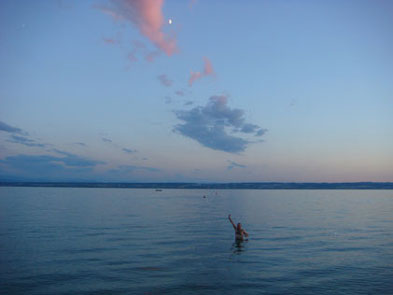 Sedan blev det några mil igen innan vi insåg att det var fint väder, vi hade en jätte fin lång sjö som vi åkte utefter så varför inte stanna lite tidigare och ta ett dopp? Dessutom skulle Aste fila lite på sin cykel för att passa in sina nyinköpta vindavisare och jag o Sara var riktigt badsugna så vi hittade en fin camping utefter Bodensjön. Det var verkligen fint med sjön 50 meter nedanför tältet och utsikten mot dom snötäckta fjällen i Schweiz på andra sidan. Så under tiden Aste filade så körde jag o Sara en tvättmaskin och sedan gick vi ner och badade.