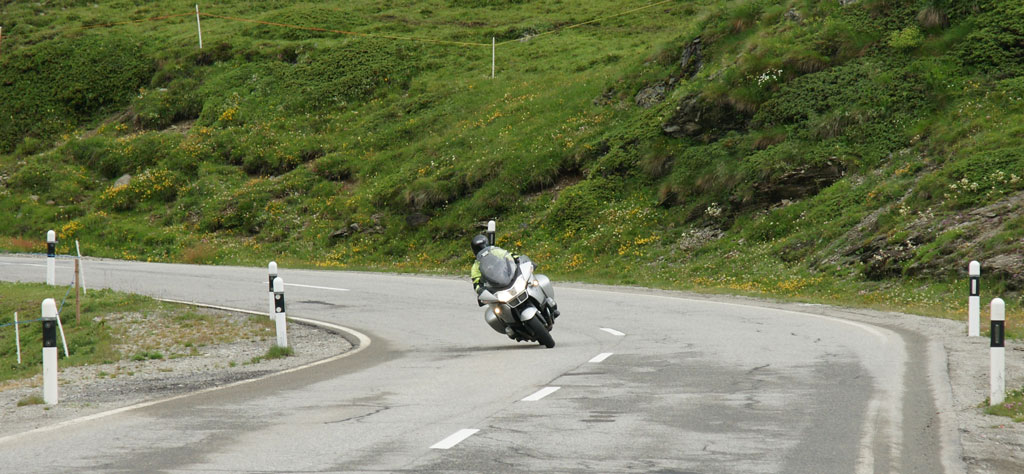 Här kommer Aste i god fart genom en böj. Men här är vi fortfarande kvar på dom riktigt stora vägarna, här kan ju bilar mötas och det finns mittlinje. Några bergspass senare så var vägarna så smala att två bilar inte kunde mötas utom på mötesplatserna. Det var också riktigt trångt för oss på mc att möta en bil på dessa vägar. Innan varje krök så tutade bilarna för att kontrollera att det inte kom något möte. Som tur var så var det ganska glest med trafik men vid några tillfällen var det nog bra att byxorna satt uppe med hängslen... Jag fick några möten där jag skulle balansera på min meter som var kvar av vägbanan och till höger om mig hade jag ca 5 cm grässträng utanför asfalten och sedan 500 meter lodrätt stup. Så det var lite darrigt minst sagt. Men det måste ha varit ännu värre för Sara som är en tvättäkta slätt skåning och som dessutom inte haft kortet så länge. Men då var det ju klockrent med radiokommunikationen oss emellan. Så när Aste som körde först varnade för bil så svängde Sara in till bergssidan och stannade och lät bilen passera på utsidan. Men både jag och Aste fick nog erkänna att det var ganska läskigt för oss också.