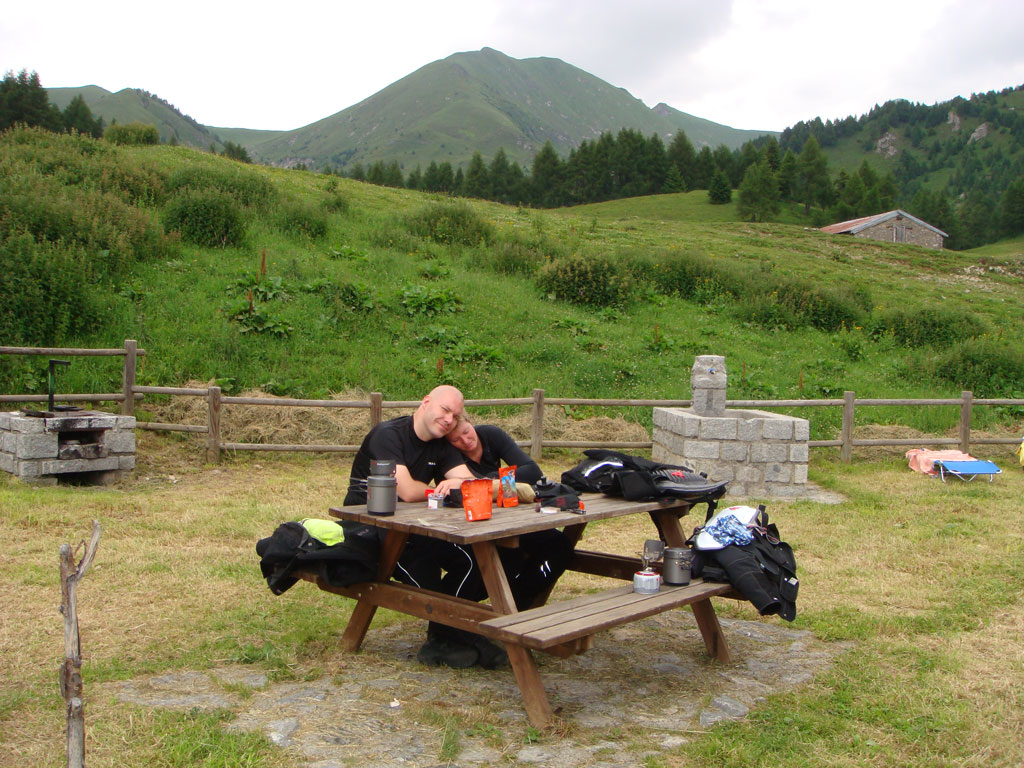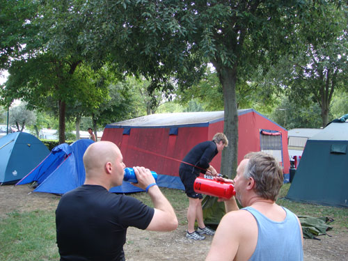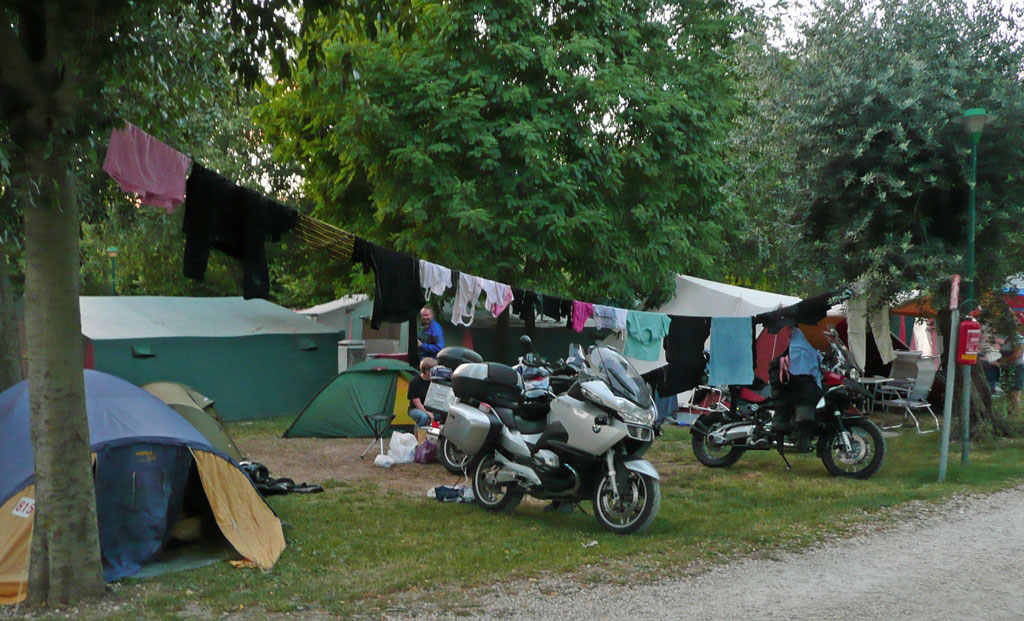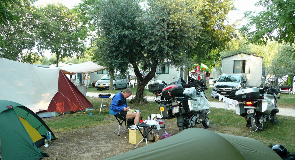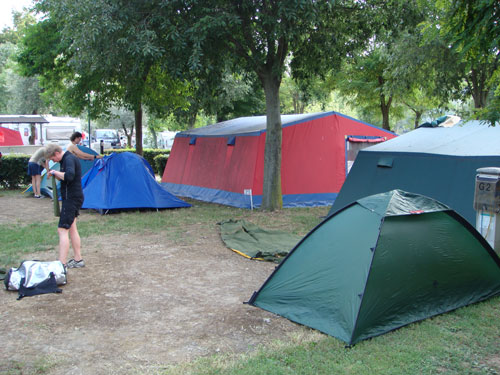 Trots att det var i stort sett fullbelagt på alla hundratals campingplatser runt Gardasjön (Detta fick vi reda på lite senare) så lyckades vi få en plats vid första försöket. Ganska dyrt men fri dusch, mysiga bad pooler och bara några hundra meter ner till sjön. Det fanns också en bra affär med färskt bröd varje morgon och ganska bra utbud på mat och dryck. Och med mitt Hillebergs Unna så var det som vanligt. När dom andra stod och skakade ur tältet ut påsen så var mitt redan uppsatt. Just här så undrade Sara om inte Aste skulle hjälpa till lite.... Men han tyckte att det var bra om Sara tränade på att sätta upp tältet själv. Så vi slog oss ned med varsin whiskey flaska och studerade förloppet. Andra campinggäster som gick förbi tittade lite undrande på vår arbetsordning.