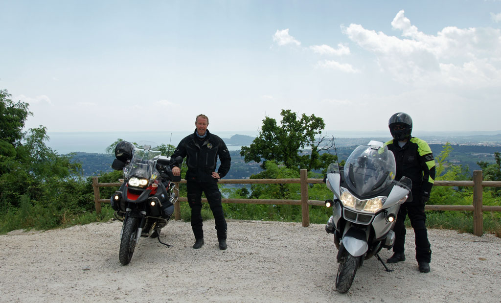 Dagen efter var jag o Aste lite rastlösa så vi drog ett varv i bergen strax bredvid sjön. Och vilka vägar det var.... Mumma. Kanonfin asfalt, konstant superkurvigt och helt underbart. Det enda felet var att det var på tok för varmt, ca 35 grader i skuggan. Och att då jobba på lite med ett "ganska" tätt GoreTex ställ på sig gjorde att GoreTex'en verkligen visade att den inte släpper igenom "vätska". Och eftersom jag svettades kopiöst i värmen och solen så var det ganska mycket "vätska" som gärna ville komma ut men som effektivt hölls kvar inne i stället. Så jag drog tillbaka till campingen för att slänga mig i poolen direkt efter vi hade fått en turist att fota oss med utsikt över den södra delen av Garda sjön men Aste tog en sväng till. Han hade senare stött på ett gäng Italienare som han körde ifrån och sedan fick han ett skyfall på sig så han var plaskvåt, i alla fall på utsidan, när han kom tillbaka till campingen.