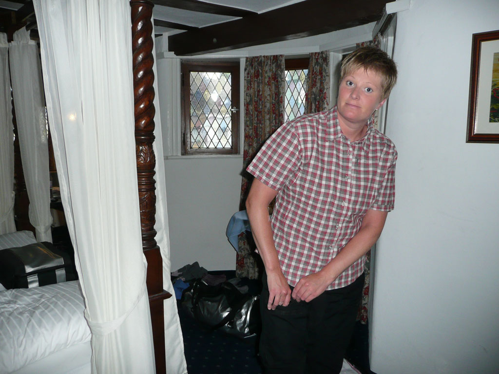 Så jag kunde till och med stappla över till A&S rum som låg i den äldre delen av hotellet för att fråga om dom var klara för lite mat. Och dom hade ett riktigt mysigt rum med originalglas och himmelssäng.