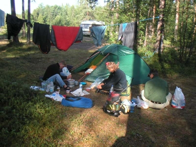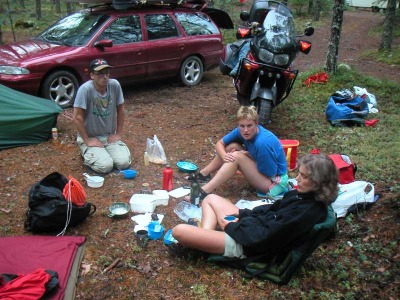 ResanEftersom vi ville ha våra egna kajaker med oss så blev det till att åka bil. På utsidan.se hittade vi Kalle som också skulle dit och åkte med oss. Vi valde att åka 45:an upp hela vägen, via Gällivare och Kiruna över mot Narvik och E10:an ut. Vi trodde att vi skulle tjäna på det tidsmässigt eftersom det är ganska rak 110-väg stora delar av vägen. Det var ca 180 mil till Kråkberget där vi skulle samlas. Vi startade på fredag eftermiddag, lite sent eftersom Kalles tågbyte i Karlstad inte väntade på honom. Vi tältade på vägen upp och åt till stora delar medhavd mat. Första övernattningen blev strax norr om Orsa. Här har vi just ätit Tjälknöl och potatissallad. Lasse åkte med på motorcykel och körde sedan vidare till Nordkap. Strax innan Sveg stod han vid vägkanten och viftade när vi åkte förbi. Soppatorsk! Som tröst fick han en kaka när vi kom tillbaka och räddade honom. Skall passa på att berömma alla Statoilmackarna på vägen. Eftersom jag har