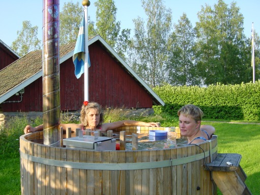 kaffe och kakor. Dag två åkte vi långt, nästa tältplats blev strax utanför Gällivare. När vi väl hade tagit oss ner på E10:an så var vi inne på de norska fina och vackra men väldig krokiga vägarna. Det kändes som om vi aldrig skulle komma fram. Det blev ett fikastopp, med kaffe och våffla på ett charmigt ställe. Men det var dyrt, förstås. Hur långt kan det vara kvar nu då? På vägen hem åkte vi på inrådan från norrmännen färjan från Lödingen till Bognes och sedan det som kallas för Silvervägen över mot Arvidsjaur. Hemresan blev på det sättet 30 mil kortare. Och det var en betydligt roligare väg att köra. 45:an är ganska tråkigt. Många träd blire... Fast vi genade innan Arjeplog och hamnade på en liten grusväg. Men det var klart kortare och snabbare ändå. Vi körde även vägen om Bräcke för att släppa av Kalle som skulle iväg på grottmöte. Därifrån genade vi också lite så att vi slapp kroken förbi Sveg. Vi körde total 180+150 mil. Uppresan tog drygt två dar, vi startade på fredag em och var framme på söndag em. Hemresan gick på två dar, start lördag morgon och hemma söndag kväll. Vi klarade att köra gamle forden med 3 personer och packning plus två kajaker på 0,85 l/mil. När vi kom hem så tog vi oss ett bad.